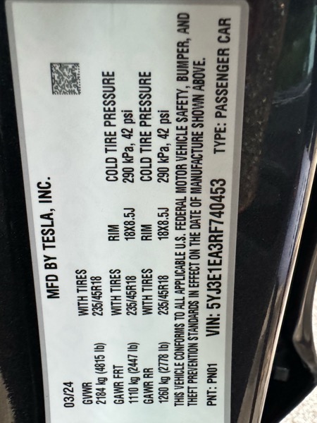 1 OWNER! 2024 TESLA MODEL 3. GREY EXTERIOR. BLACK INTERIOR. ACCENT AMBIENT INTERIOR COLORFUL LIGHTS. FULL SELF DRIVING COMPUTER 4 WITH AUTOPILOT CAPABILITY INCLUDED. REAR TV. NAVIGATION, LEATHER, HEATED SEATS, COLD WEATHER PACKAGE, BACKUP CAMERA. TESLA MODEL 3 IS STILL UNDER TESLA WARRANTY.TESLA WARRANTY EXPIRES APRIL. 24, 2028 OR 50,000 MILES; WHICHEVER COMES FIRST. BATTERY WARRANTY EXPIRES APRIL. 24, 2032 OR 100,000 MILES; WHICHEVER COMES FIRST. EXCELLENT CONDITION!